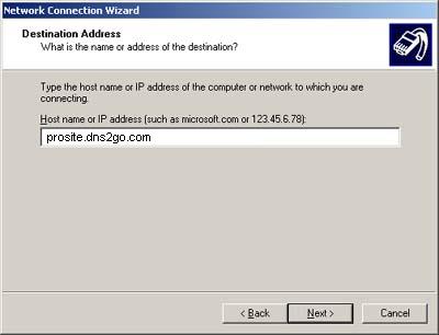 Enter either the IP name (DNS) or IP address of the VPN server and click on Next. For DWG VPN server, the DNS is currently prosite.dns2go.com.