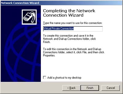 If this is the first time you have run Dialup Networking, you may be asked to enter your location and telephone area code. Enter these details (although they will not affect the VPN connection you are going to create) and click on Next or Finish as appropriate.
